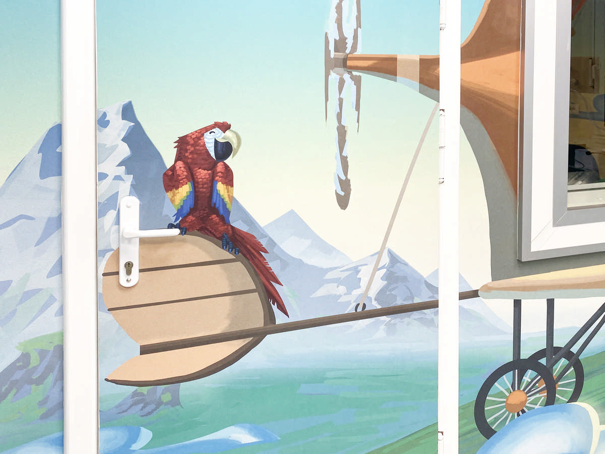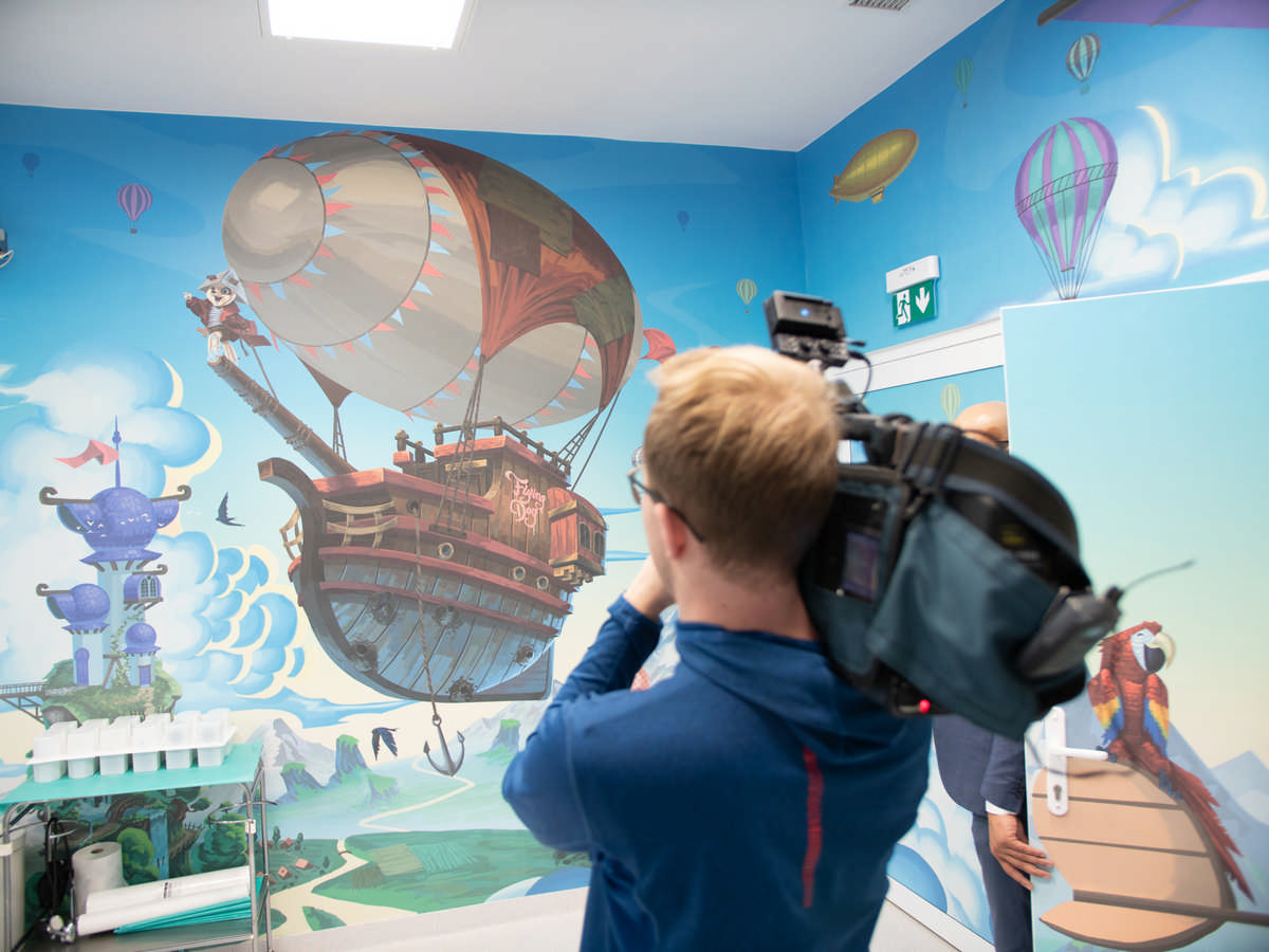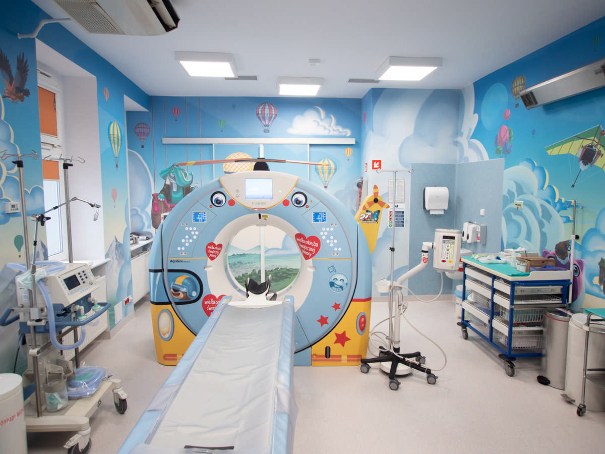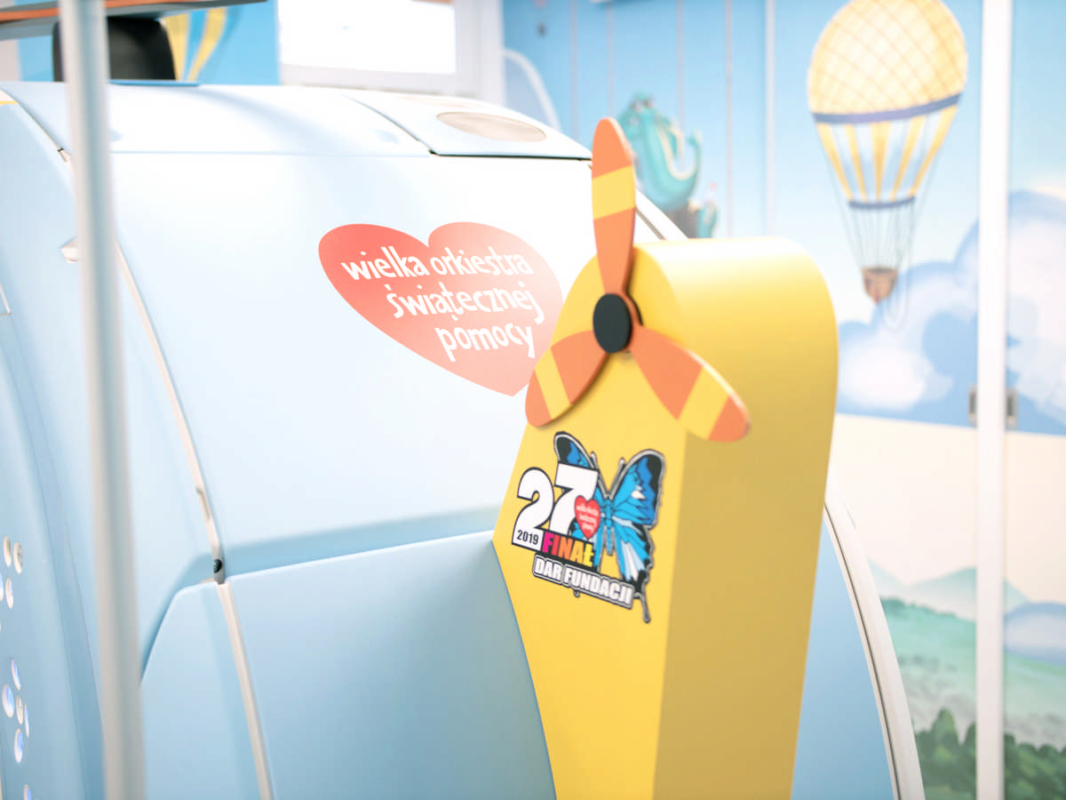 In this extraordinary lab, everyone feels like Peter Pan and soar high into the clouds. The walls are decorated with cartoon-like images of aircraft, balloons or zeppelins. The tomograph by means of magical, graphical tricks has changed into a cheerful flying vehicle. Ready for the take off?