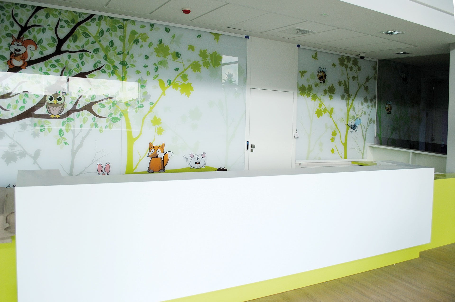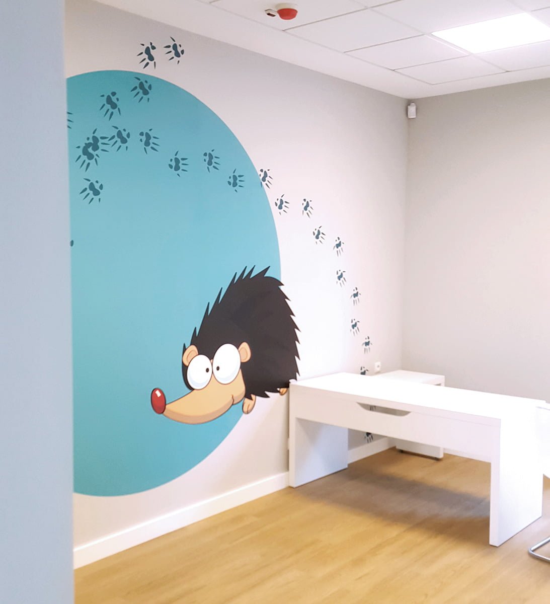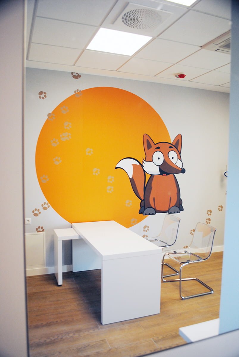 جراحة كل طبيب لها طابعها الخاص: سنجاب أو قنفذ أو ثعلب. عند تسجيل الوصول ، يتلقى الطفل تعويذة للشخصية المعنية. يصل الطفل إلى عيادة الطبيب باتباع آثار الحيوانات المطبوعة على جدران العيادة.